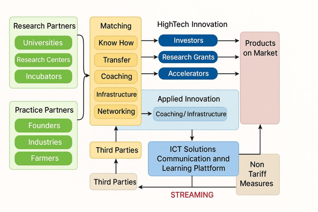 - Fostering the innovation transfer into practice with an AI based networking platform, joint innovation hubs in Africa and sensitization for an entrepreneurial mindset among researchers (e.g. PhD students);